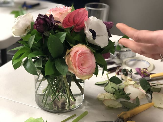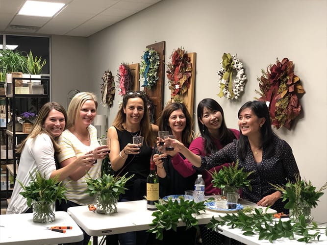 Blumengärten offers flower design classes! Spend an evening at our shop learning beautiful design techniques, sipping wine, and meeting new friends. After a night of fun you will leave with the arrangement you created! Classes start at 7:00pm.